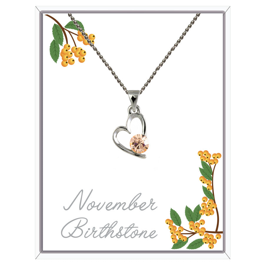 \nBuy this beautiful heart shaped pendant for November embellished with a birthstone crystal. In the colour of citrine which is the birthstone for November. These pendants are exquisite and unique and add a bit of sparkle to any outfit at any time of the year. Birthstone pendants are the perfect birthday gift. The wearing of birthstones is thought to bring good luck, good health, and protection. Astrologers long ago attributed supernatural powers to certain gemstones.
