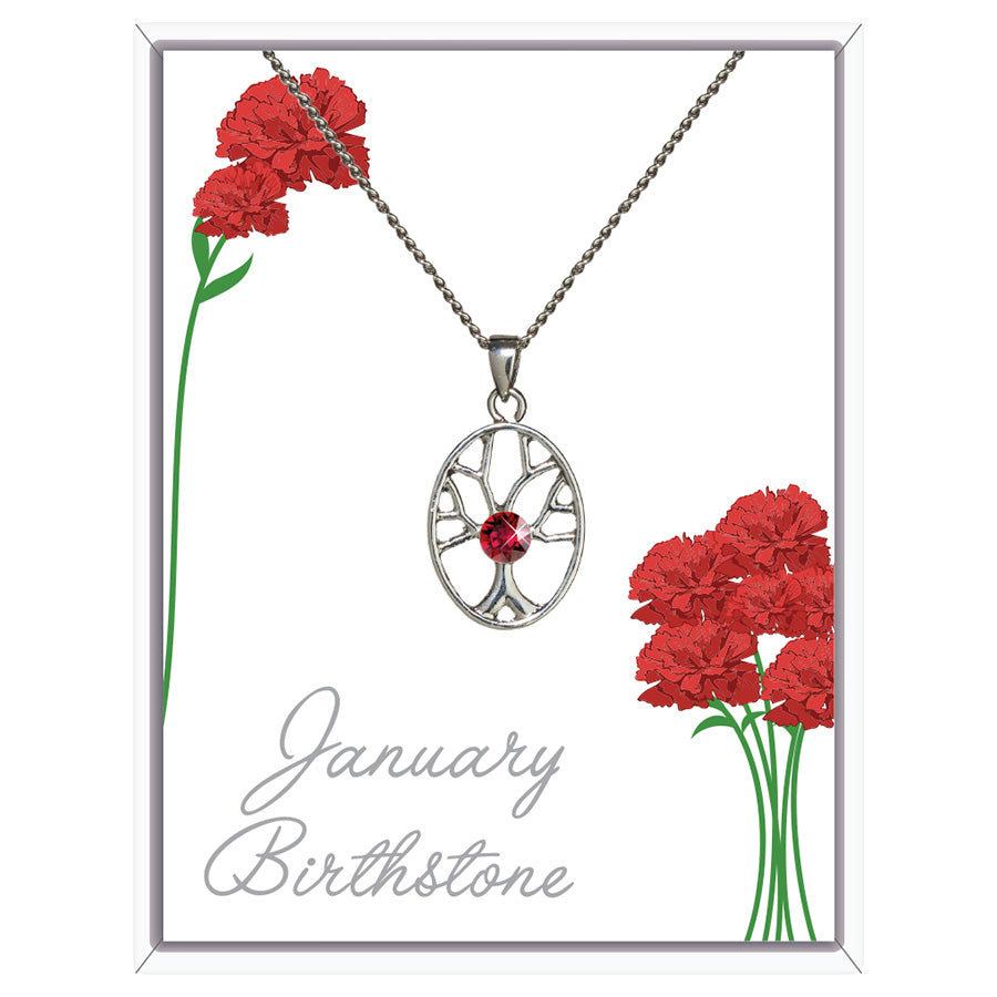 January birthstone Tree of Life Pendant \n \nBuy this beautiful tree of life pendant for January embellished with a birthstone crystal in the colour of garnet which is the birthstone for January.  These pendants are exquisite and unique and add a bit of sparkle to any outfit at any time of the year. Birthstone pendants are the perfect birthday gift or just a treat for yourself.  The wearing of birthstones is thought to bring good luck, good health, and protection. Astrologers long ago attributed supernatural powers to certain gemstones.  The Tree of Life symbol represents our personal development, uniqueness and individual beauty. \n \nYour January birthstone tree of life pendant \n \nEach pendant is rhodium plated and 24mm long, the accompanying rhodium plated chain is 16 inches long with a 2 inch extension. \n \nPresentation of your January tree of life pendant \n \nThe tree of life pendant and accompanying chain are beautifully presented in a luxuriously lined gift box.