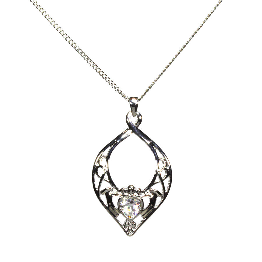 \nBuy this beautiful rhodium plated Celtic Long Claddagh pendant adorned with a crystal from our Celtic Collection. Every piece in the collection is unusual, these exquisite and eye catching designs will make a perfect addition to any outfit at any time of the year. Our designs from the Celtic Collection will make a perfect and unusual gift or why not just a treat for yourself? \n