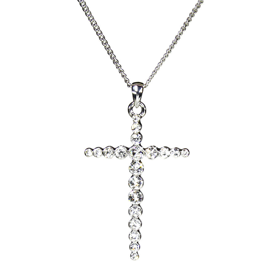 \nBuy this beautiful rhodium plated pendant in the form of a cross adorned with crystals from our Christian Collection. Every piece in the collection is unusual and unique, these exquisite and eye catching designs will make a perfect addition to any outfit at any time of the year. Our designs from the Christian Collection will also make a perfect gift.