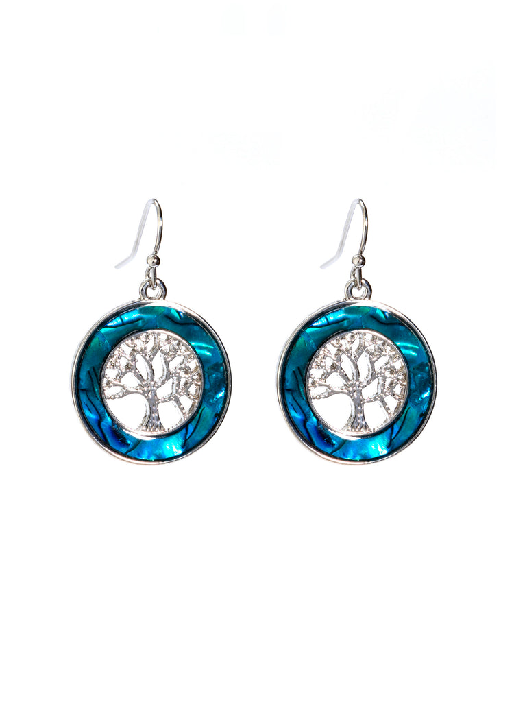 \nBuy these beautiful paua shell circle incorporating tree of life drop earrings. These earrings are exquisite and unique, no two paua shells are the same so each piece of jewellery incorporating paua shell is absolutely one of a kind. Paua shell is sometimes referred to as a marine or sea opal and are native to the shallow coastal waters around New Zealand. Paua are both rare and much sought after. Paua shell is important in Maori culture and are regarding as somewhat of a treasure. With such a vast array of beautiful natural colours it is easy to see why paua shell lends itself so well to jewellery.