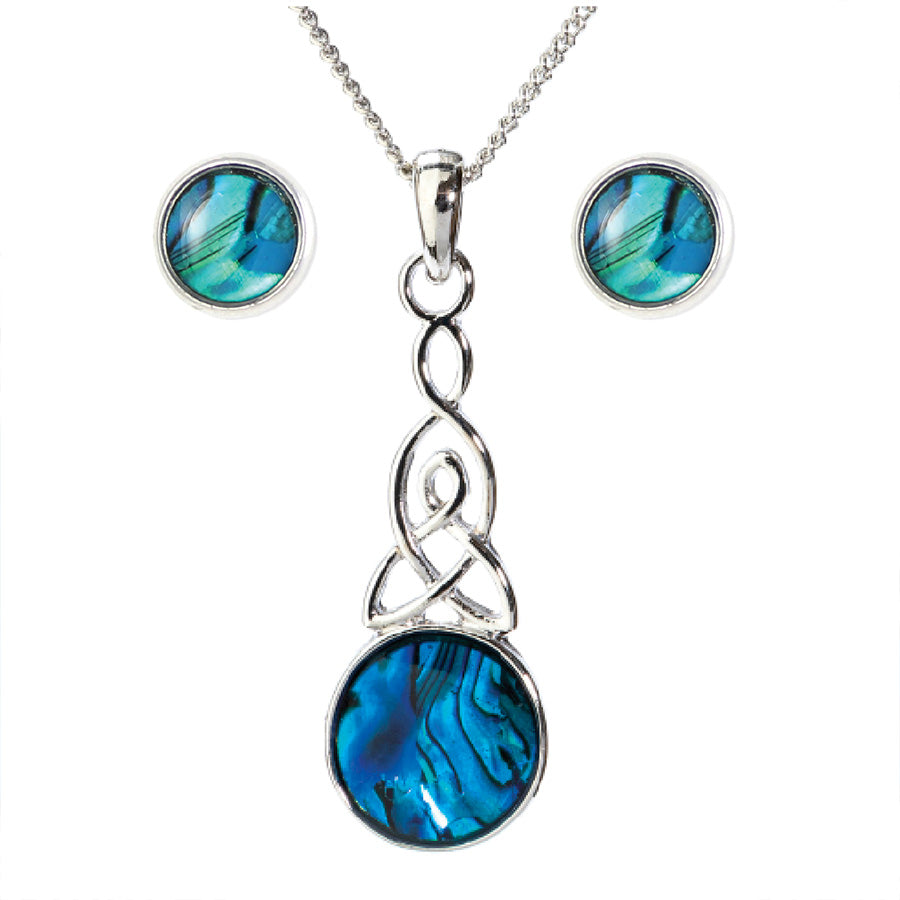 \nBuy this beautiful paua shell celtic round drop pendant and studs set. This set is exquisite and unique, no two paua shells are the same so each piece of jewellery incorporating paua shell is absolutely one of a kind. Paua shell is sometimes referred to as a marine or sea opal and are native to the shallow coastal waters around New Zealand. Paua are both rare and much sought after. Paua shell is important in Maori culture and are regarding as somewhat of a treasure. With such a vast array of beautiful natural colours it is easy to see why paua shell lends itself so well to jewellery.