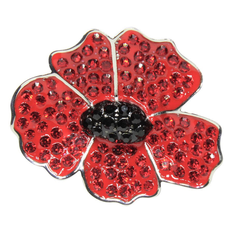 \nBuy this charming pave poppy pin. The poppy pin is hand finished in glorious poppy red crystals and are set as a single poppy head. The poppy brooch is embellished in the centre with jet crystals which add another dimension to this eye catching pin. This poppy brooch is exquisite and unique, 40mm in diameter. Furthermore wear these brooches on your coat or jacket to show your support, they look perfect on your lapel. A great addition to any outfit at any time of the year.