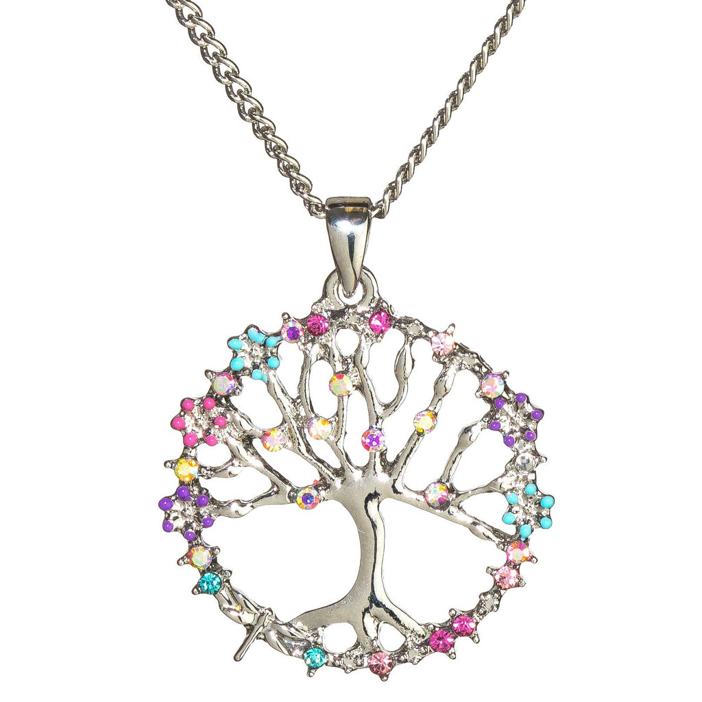 \nBuy this beautiful rhodium plated Tree of Life necklace adorned with pink and blue flowers from our Zoe Collection. Our Zoe Collection is inspired by nature and the life that’s around us and is exclusive to Lila Jewellery. Every piece in the collection is unusual and colourful so these exquisite and unique designs will make a perfect and delicate colourful addition to any outfit at any time of the year. Each exclusive piece conjures up a memory of summer to brighten up any day. Our exclusive designs from the Zoe Collection will make a perfect and unusual gift or why not just a treat for yourself?