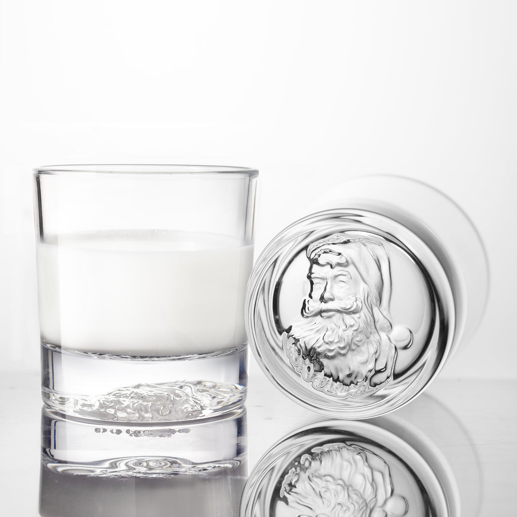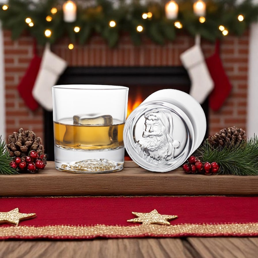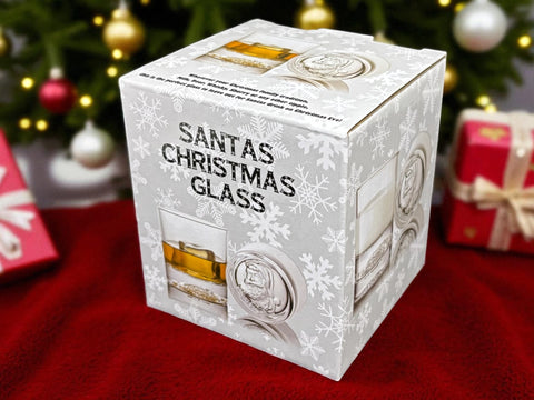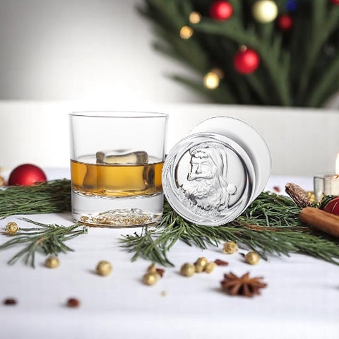 High quality whisky tumbler featuring an image of Santa stamped in to the base of the glass.